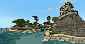 Rhyolia Village: A set of islands forming one town in the land of Rhyolia! Contains references to the season 2 Rhyolia village, such as the church and the villager houses. It has villagers for players to trade with, and can be visited via /pwarp Rhyolia. Also features my message to friends and the wider Prism community!